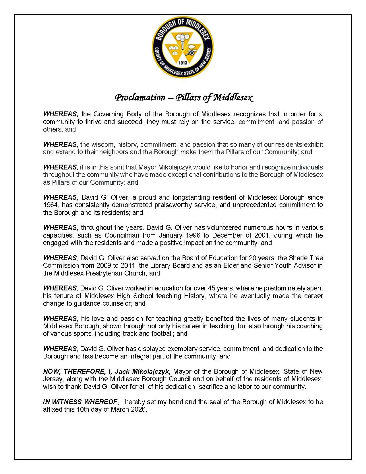 The Borough of Middlesex, led by Mayor Jack Mikolajczyk, proudly recognizes David G. Oliver as a Pillar of the Community for his praiseworthy service, and unprecedented commitment to the Borough and its residents.