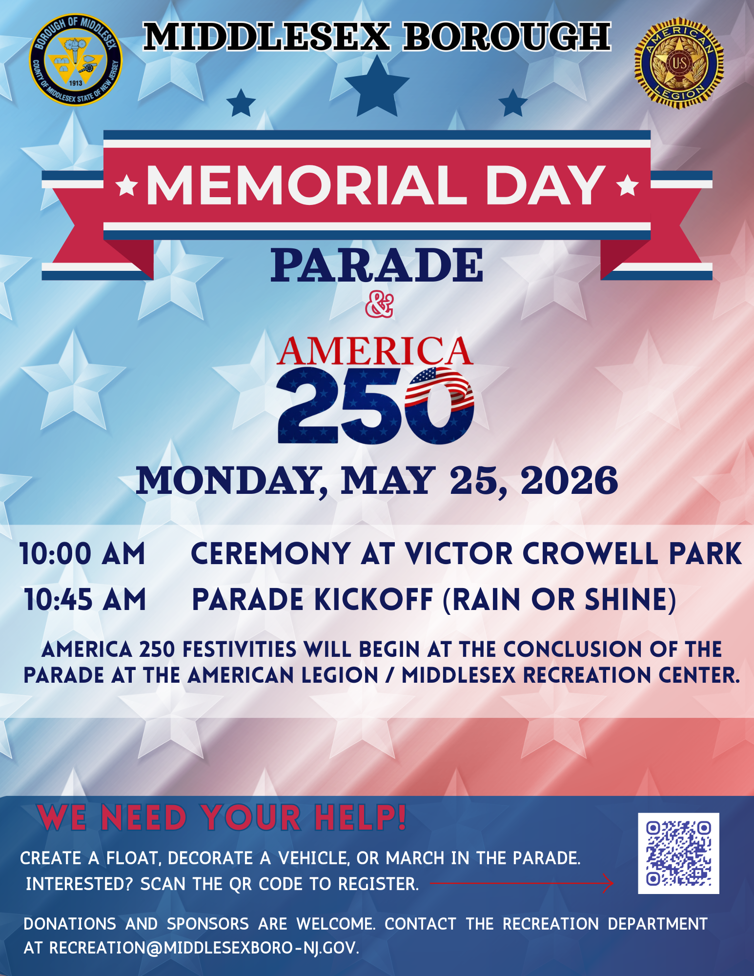 The Middlesex Borough Recreation Department and American Legion Post 306 invite you to this year’s Memorial Day Parade and America 250 Celebration on Monday, May 25.