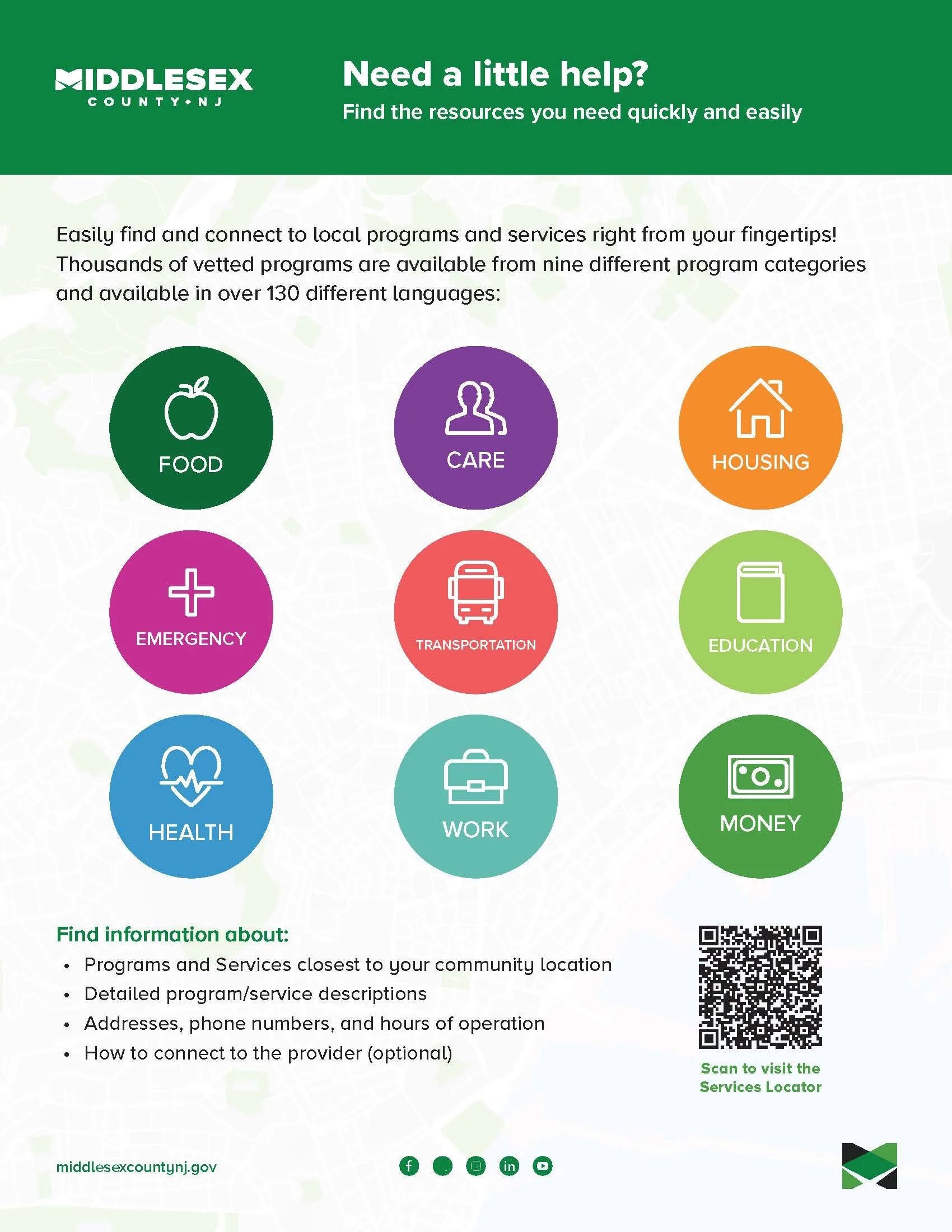 Easily find and connect to local programs and services right from your fingertips! Thousands of vetted programs are available from nine different program categories and available in over 130 different languages.
